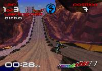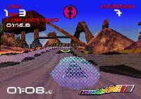 There are 6 tracks to race on, ranging in theme from deserts to ice worlds. However, it must be said that the track graphics ultimately make no difference to the handling, as the hovercraft just… hover. Terrain differences, therefore, are visual only. The tracks are well designed and detailed, with the track curvature masking graphical pop-in well in most cases and the draw distance not being too obtrusive on the straights. Textures are relatively low-resolution, but there are enough gradients in the color schemes that they blend the textures and keep them from looking too rough in most places – a small victory for aesthetics over technical muscle. There are massive variations in height along the tracks – lots of climbs and drops – as well as a good deal of sharp twists and turns. There are also sheer drops that must be cleared; otherwise, the hovercraft falls off the track and must be repositioned by a retriever-bot, costing the racer precious seconds. Finally, there are power-up tiles built into the tracks that either confer a speed burst or add a weapon to the player’s arsenal.