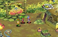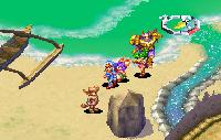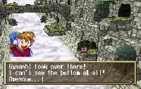 Here, the player really must use their L and R buttons to shift the 3D landscape around, to find all the nooks of treasure or paths forward. Some areas feature set pieces that Justin and party can activate — for example, knocking over a loose pillar to bridge a gap. These are usually indicated by an exclamation point icon when the party nears the set piece.